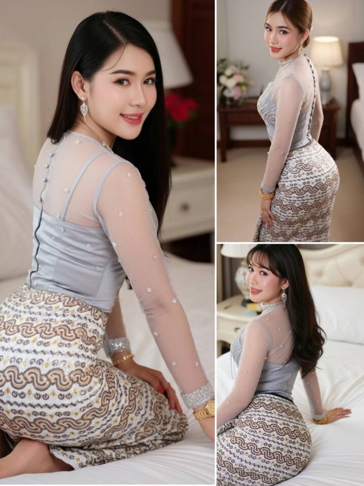 ပြောပြီးသည်နှင့် သန်းနုသည် သူမ၏ ခါးတွင် ညှပ်လို့ထားသော ထမိန်စလေးကို လက်တဖက်ဖြင့် ဆွဲကာ ဖြေးဖြေးချင်း ထုတ်လိုက်ပြီး လက်တစ်ဖက် တည်းနှင့်ပင် ခါးမှ ဆွဲဖြုတ်လိုက်သော ထမိန်စလေးကို ကိုင်ပြီး ထမိန်လေးကို ဖြေးဖြေးပင် ဖြန့်ကာ ထုတ်လိုက်၏ ။ ထိုအခါတွင် ထမိန်စလေးကို ကိုင်ပြီး ဖြန့်ထားသော သူမ၏ လက်ကလေး၏ အခြားတဖက်တွင် ရှိသော ထမိန်းစလေး၏ အပေါ်ဖက် အနားလေးသည် သူမ၏ ပေါင်ဖျားလောက်ထိ လျှောကျသွားပြီး ဖြူဖွေးလုံးတစ်နေသော သူမ၏ ဖင်သားကြီး တခြမ်းနှင့် ဖြူဖြူဖွေးဖွေး တုတ်ခဲကာနေသော သန်းနု၏ ပေါင်တန်ကြီး တစ်ဖက်မှာလည်း ဝင်းဝါစွာ ထွက်ပေါ်လာပြီး သန်းနု၏ ပေါင်ရင်းမှ မဲနက်ပြီး တွန့်လိမ်လို့နေသော စောက်ပွှေးလေးများပင် တချို့တဝက် ထွက်ပေါ်လို့ လာတော့၏ ။