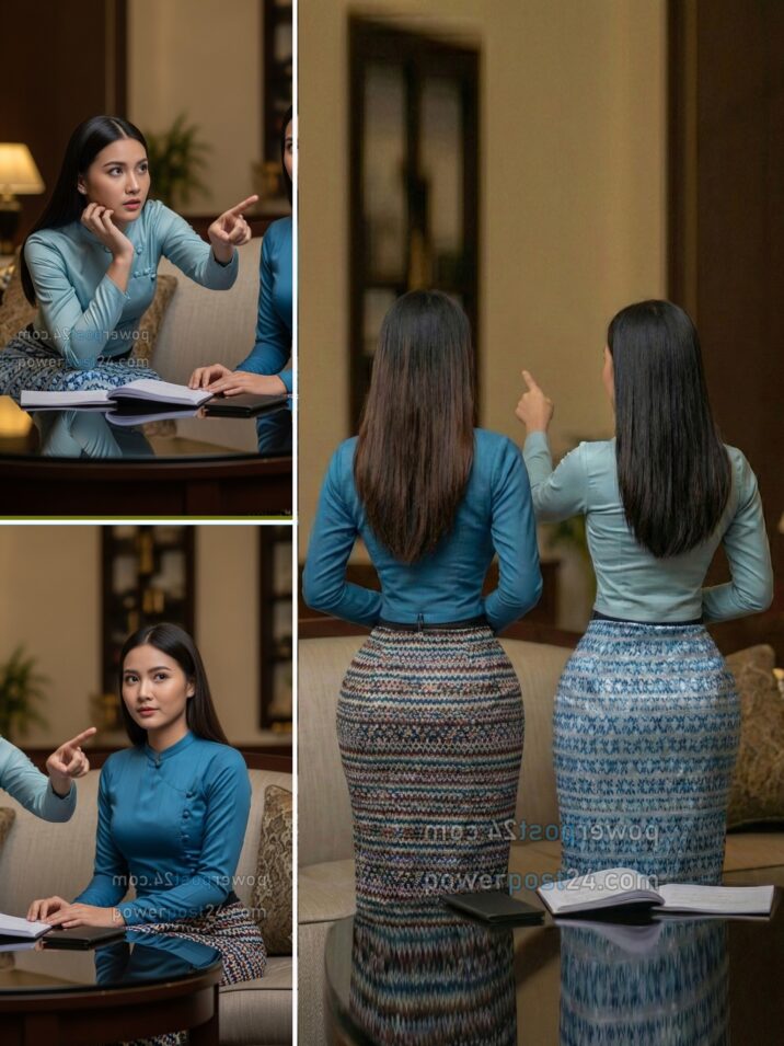 နောက်သို့လှည့်၍ အောင်ကိုမင်းကို ကျောပေးကာ ထဘီကိုခါးအထိ မလိုက်ပြီး ကုလားထိုင်ပေါ်သို့